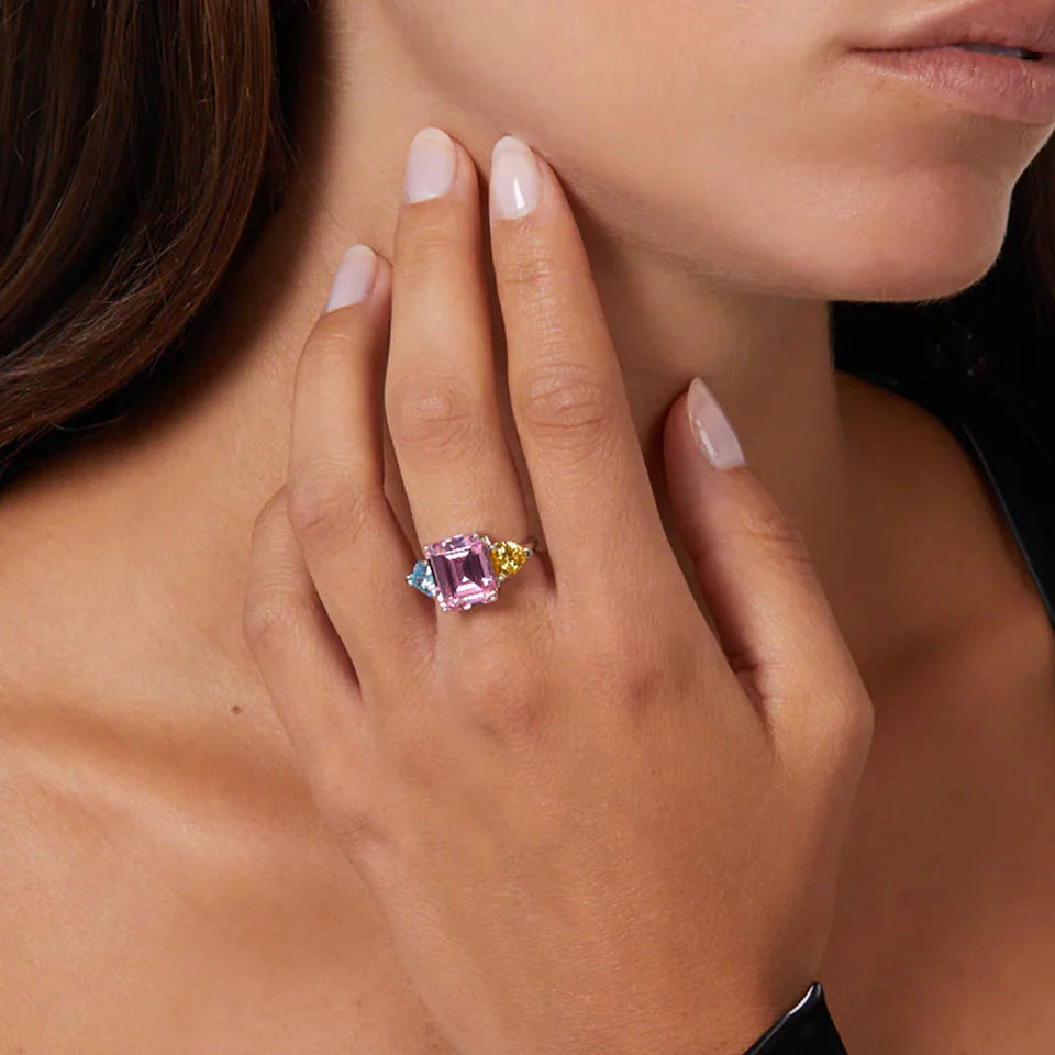 Anello con zirconi multicolore placcati in rodio, con una pietra dal taglio rettangolare rosa e due pietre dal taglio cuore azzurra e gialla.