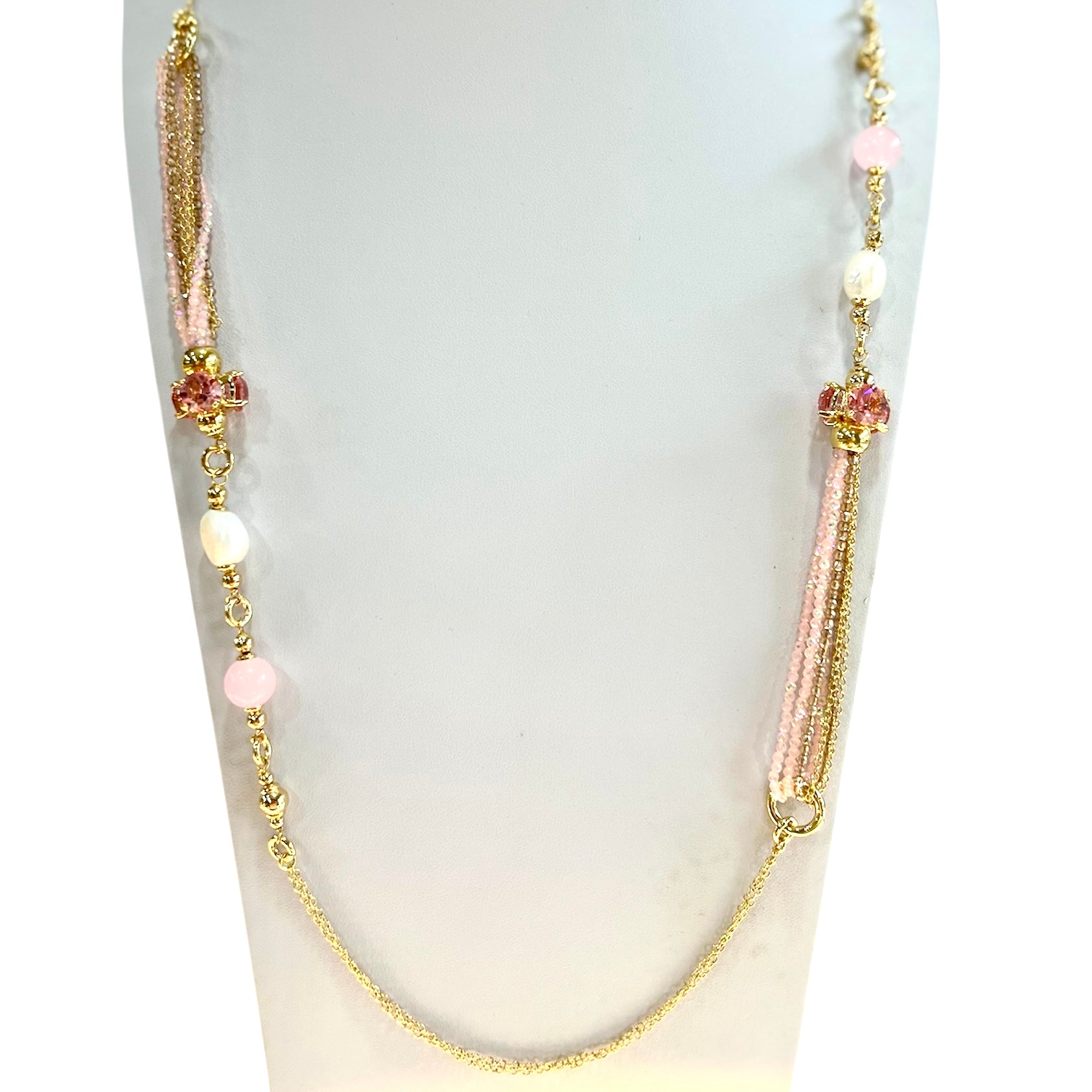 Collana Lorenzo Ungari della collezione Gent Lunga 90cm, possibilità di fare il doppio giro Collana galvanizzata oro giallo, impreziosita da delle pietre e degli zirconi rosa. Chiusura con regolazione. Confezione e garanzia originale Ungari