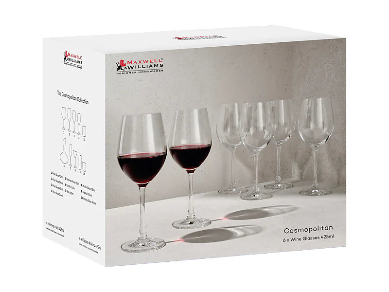 Questo set di sei calici da vino Cosmopolitan da 425ml donerà un tocco di brillantezza alla vostra tavola. Questi splendidi bicchieri hanno un aspetto fresco e moderno, con la trasparenza distintiva del vetro cristallino di qualità. Con un design classico e una forma leggermente affusolata, sono eleganti bicchieri che amerete usare ogni giorno. Un'ottima idea regalo per inaugurazioni di casa e occasioni speciali, o un'aggiunta classica alla vostra cucina.